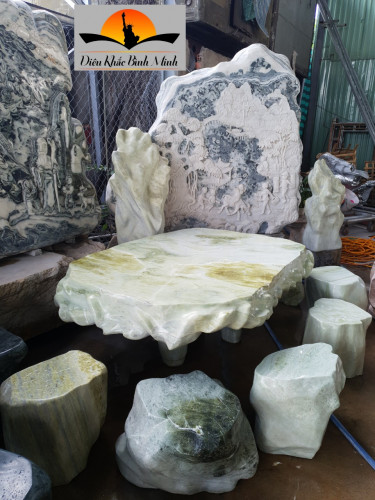 Sản phẩm bộ bàn ghế đá tại Điêu khắc Bình Minh được làm bằng loại đá tự nhiên được hình thành trong tự nhiên. Loại đá này sau khi khai thác sẽ được làm sạch và chế tác, trạm trổ, điêu khắc theo mẫu mã, kiểu dáng yêu cầu của khách hàng, sản phẩm không bị pha trộn lẫn các tạp chất khác.